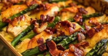 Ingredients 1 pound of fresh asparagus, peeled and sliced into 1-inch pieces; 6 chopped slices of bacon; 3 cups of…