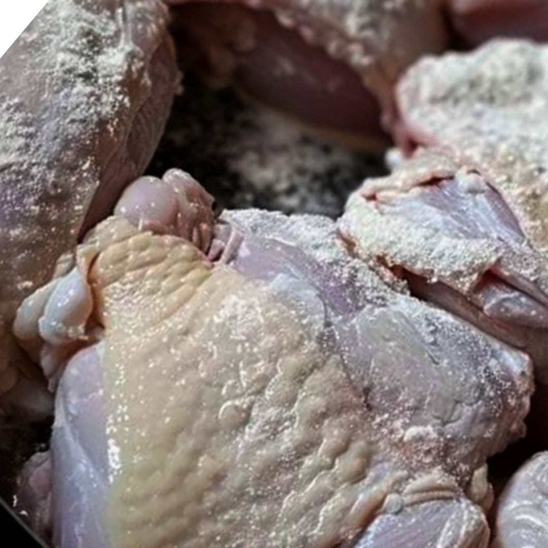 Begin by lightly coating the chicken thighs in all-purpose flour, tapping off any excess.