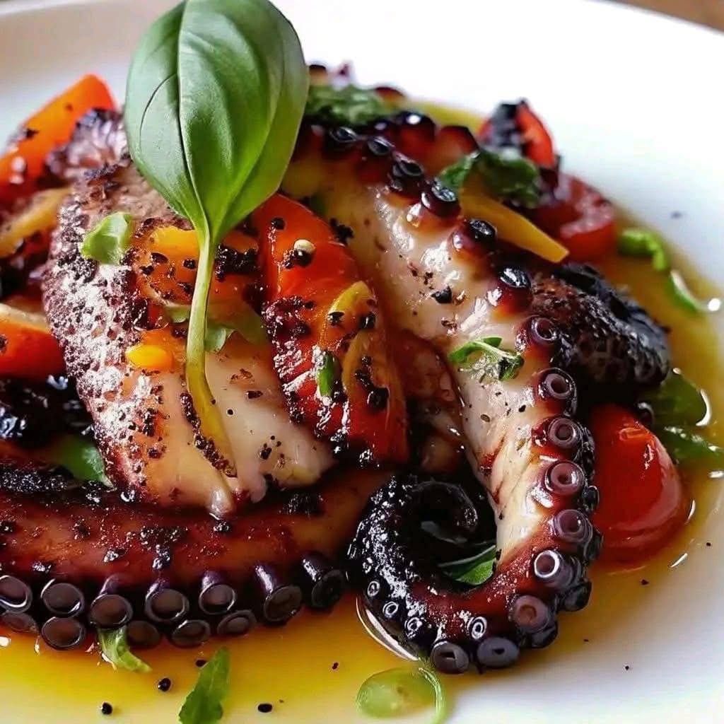 - Assemble Salad: In a large bowl, combine the halved cherry tomatoes and torn basil leaves. Add the grilled octopus pieces.