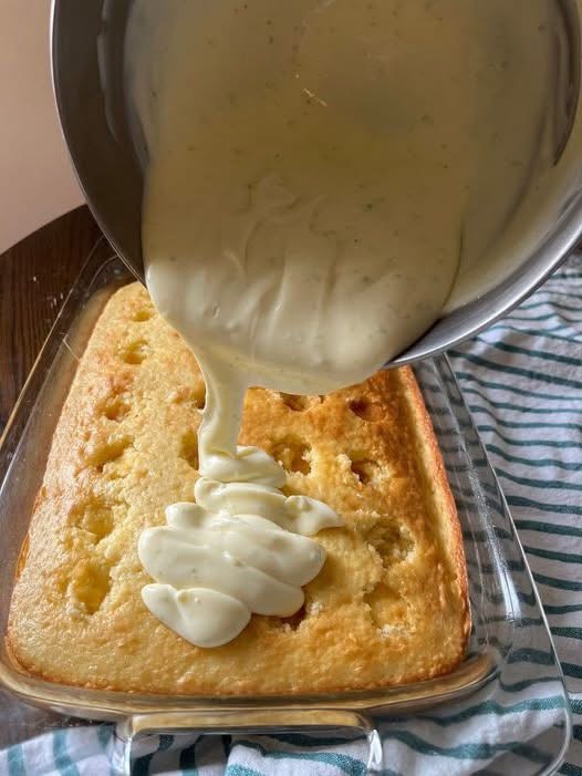 · Slowly pour the key lime filling mixture over the warm cake, aiming to fill the holes as much as possible. Use a spatula to gently spread it and help it seep down.