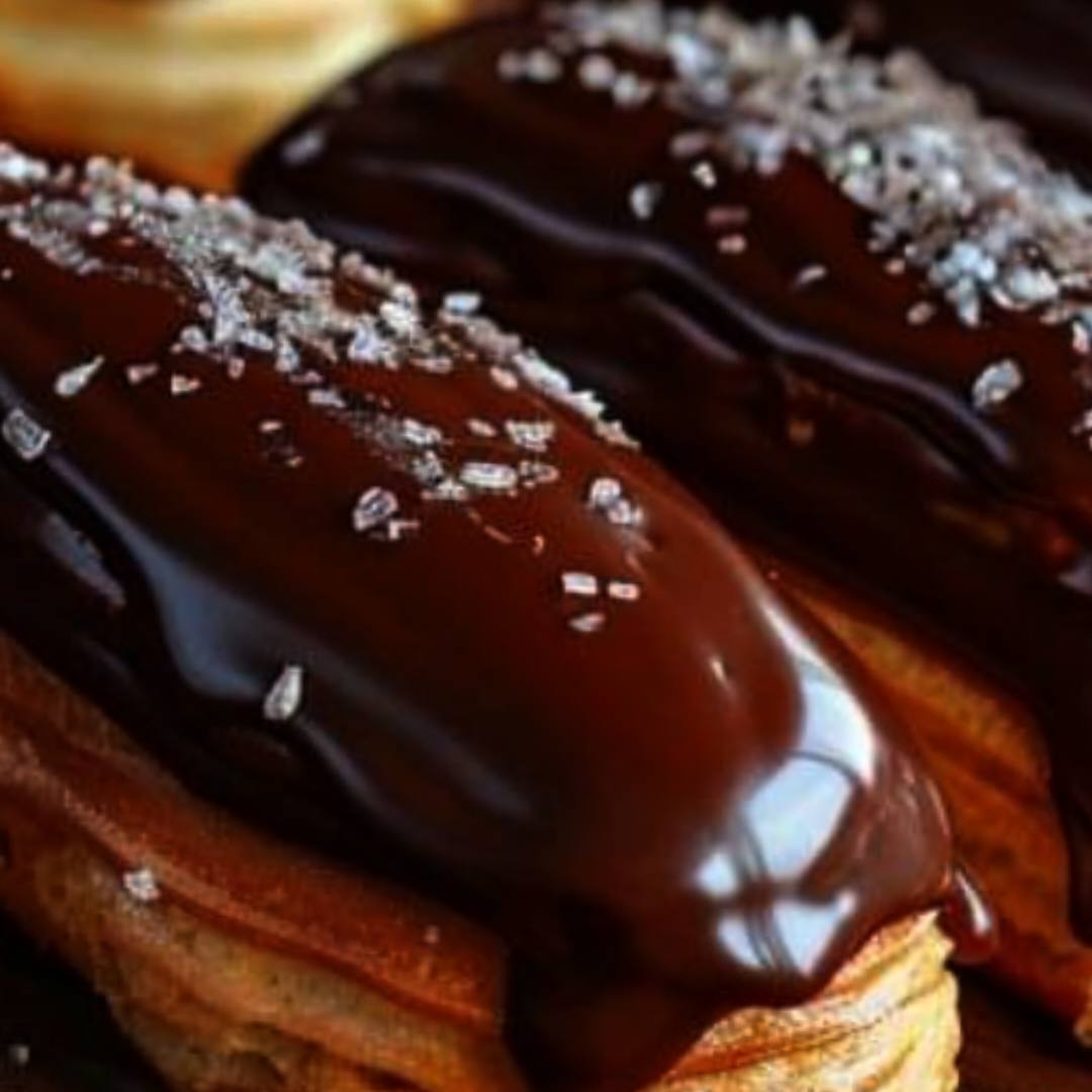 8. Before setting aside to set, dip the tops of each eclair into the chocolate glaze.