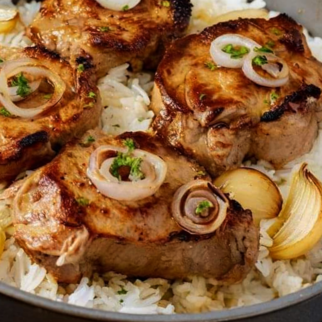 Serve the pork chops over a bed of rice and onions, spooning some of the flavorful juices over the top.
