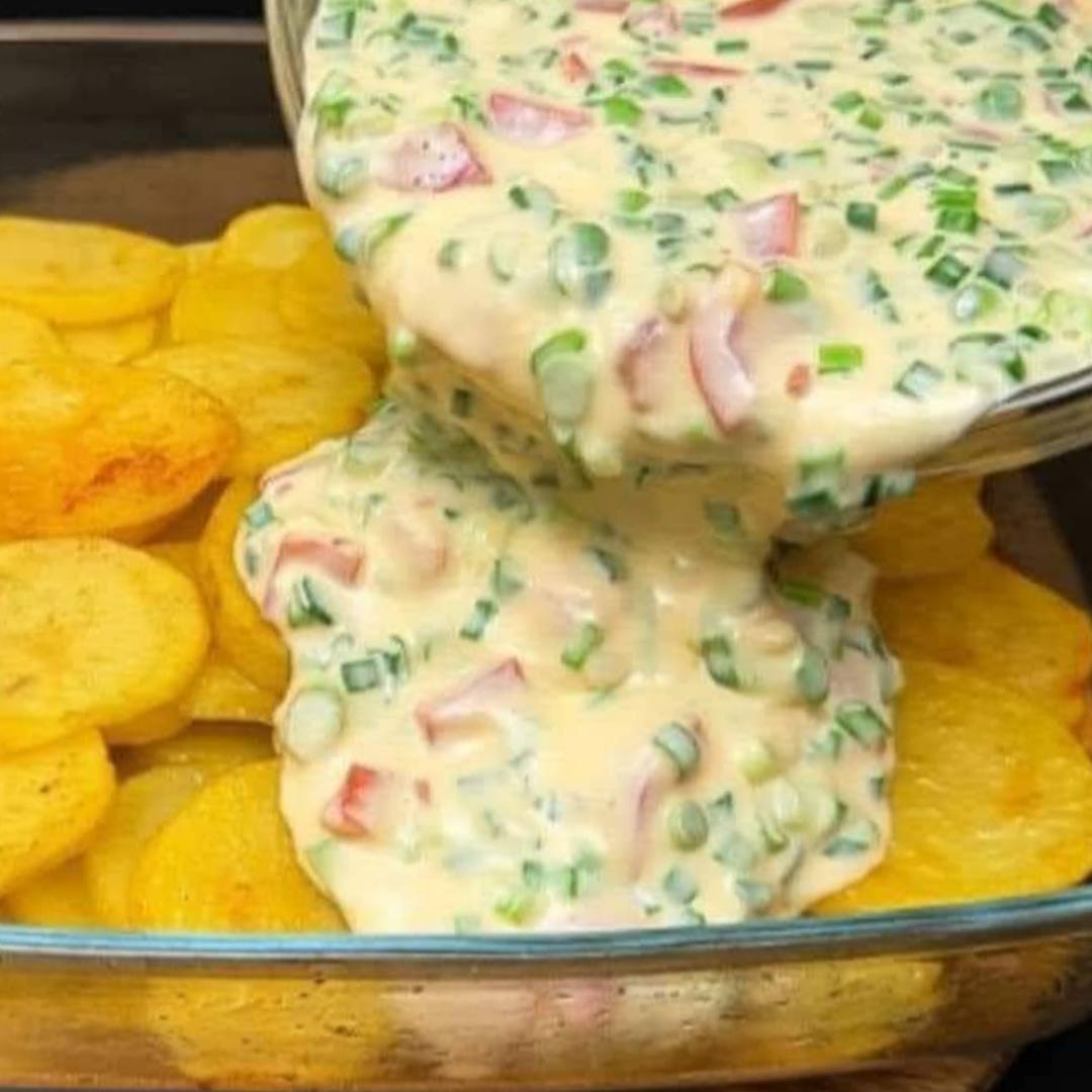 - Pour the egg mixture over the potatoes in the baking dish, ensuring that the potatoes are evenly coated.