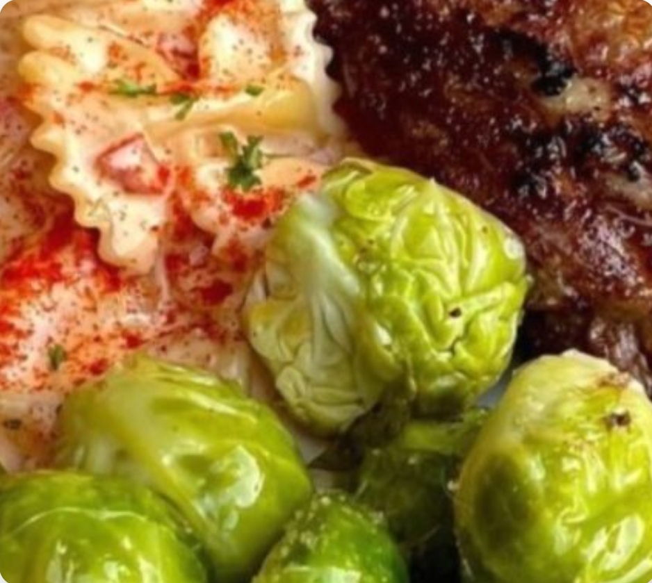Ribeye, smoked pimento gouda farfalle and Brussels sprouts
